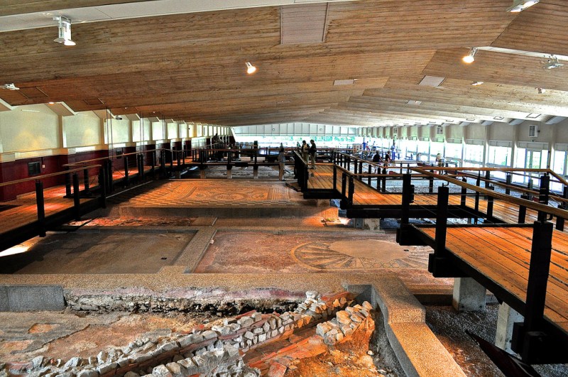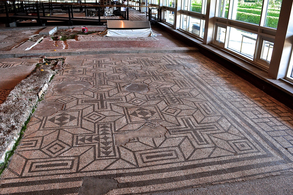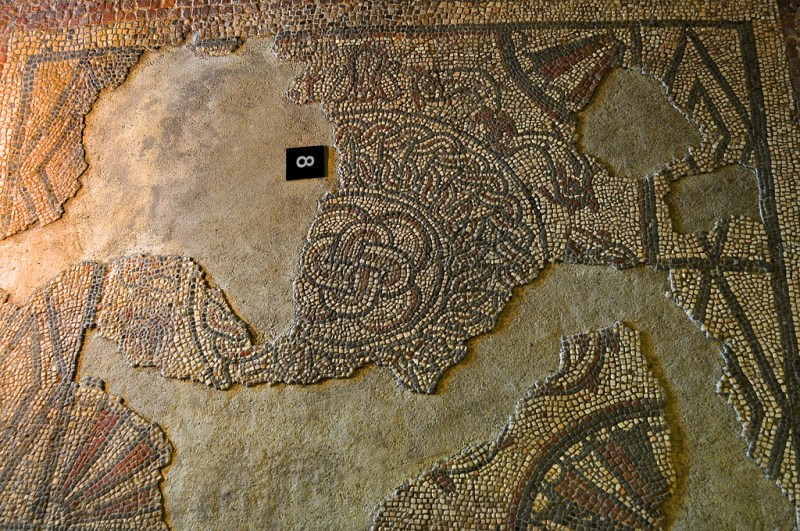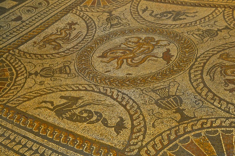 I love the idea that the guide mentioned – that mosaic specialists would have wandered from rich family to rich family – with examples of the floors they could do and their own style!  These were primarily black and white … with the famous Dolphin floor added at a later date – actually on top of an existing mosaic – this had colour and must have been spectacular in the day.