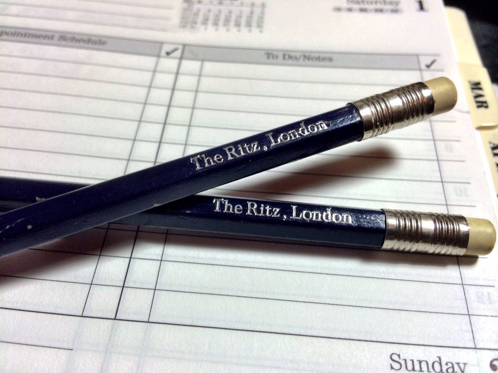 A more modest memory, came from The Ritz in London after one of their parties. As part of a goody bag, they included a box of Ritz pencils – sleek, dark blue with rubber tips. The more exotic potions and lotions have long since been used and forgotten but the pencils – well two of the ten actually – still remain my pencil of choice and a happy memory of Piccadilly’s classic hotel.
