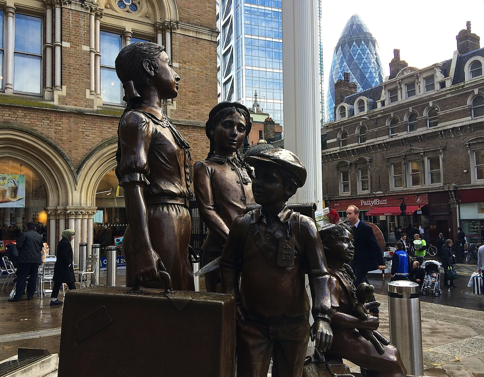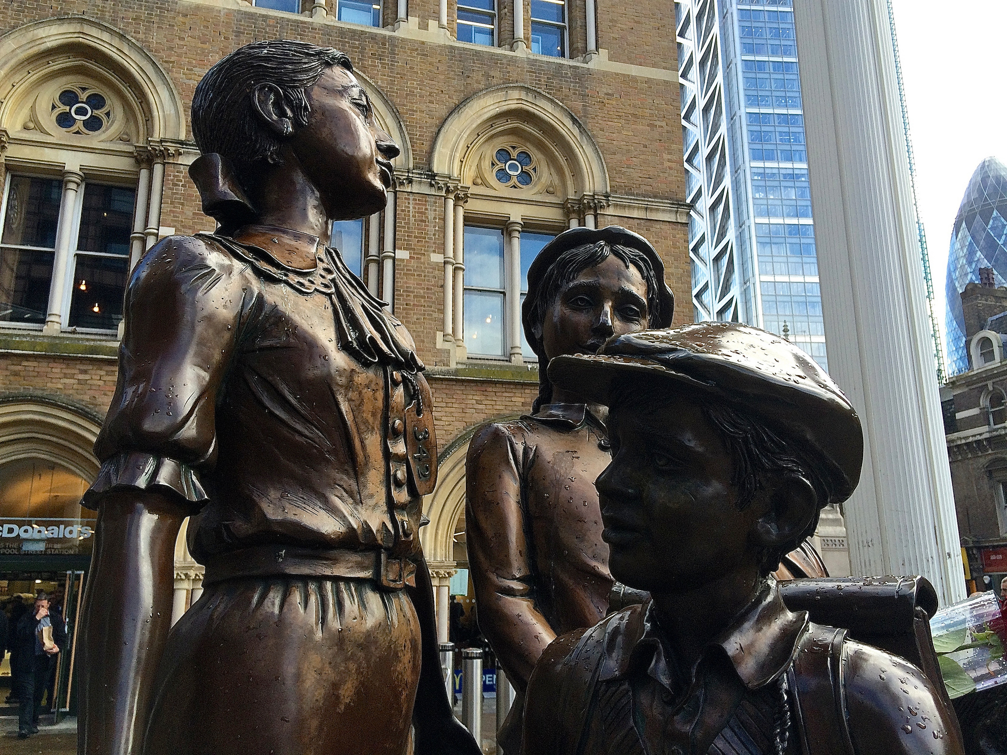 I don’t know about you, but I often walk around London without taking clear note of my surroundings – intent only on reaching my destination. It’s when I arrive early somewhere for a meeting (30 minutes in this instance) that I feel I have the time to look around – and when visiting Liverpool Street Station, I’m so glad I did. This statue was surrounded by people sitting on it, having a sandwich, resting their feet but all stood up and turned to give it a second look when I started taking pictures of it!
