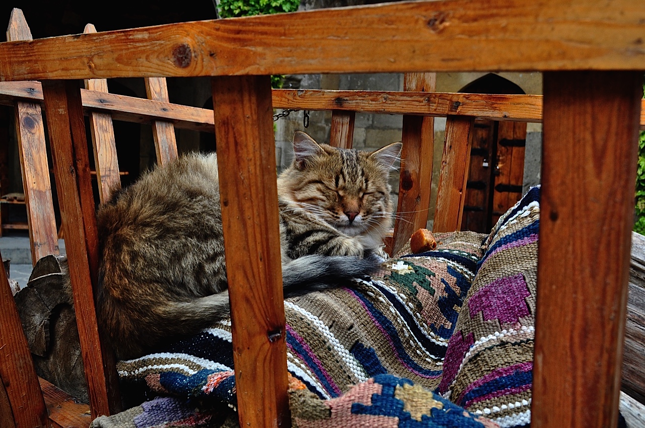 It always surprises me whenever I travel how many nations love the small fluffy animal which is Felis catus or the domestic cat. (Above – Baku, Azerbaijani resident at the Karvansara Restoran in the Inner City).