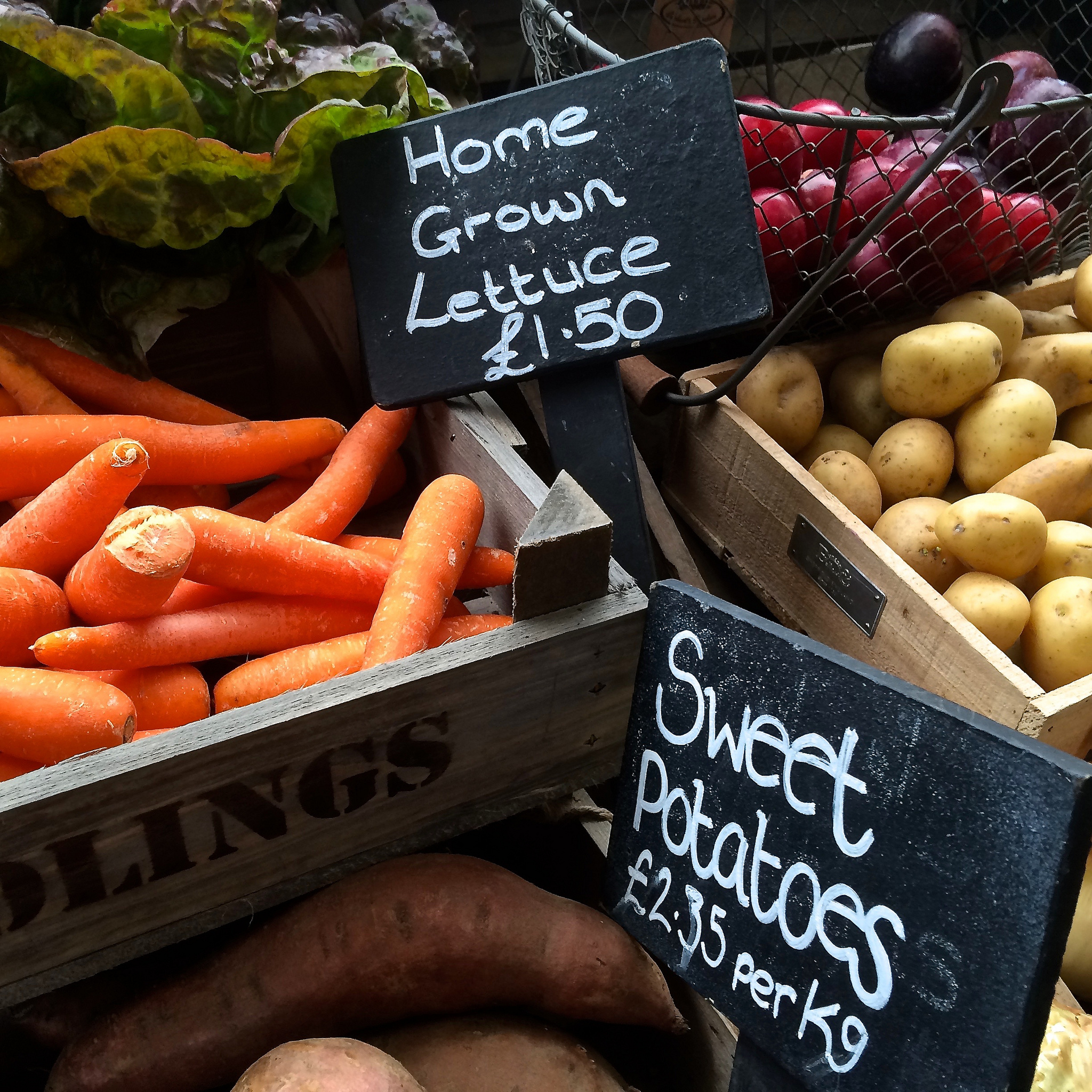 A central viewing point such as a car, surrounded by banks of colour, hand-written chalk blackboard signs, brown paper bags for vegetables – it all harks back to the childhood of most of the clientele that come here – a romanticised, retro childhood which all in all now look rather chic!