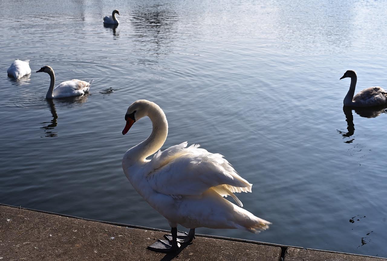 These elegant birds are mute swans and around 60 of them can gather at Canoe Lake in winter – these are juvenile swans – ones who have not yet paired up for life. There are around 30,000 mute swans in Britain and Canoe Lake seems to have been chosen by them as a swan nursery.