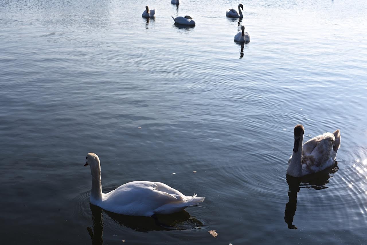 Why mute? Well they are silent in flight and only communicate with quiet grunts and barks. They can definitely move however and good job too – as miniature motorised boats regularly take to the water, manoeuvring between the gathered swans.